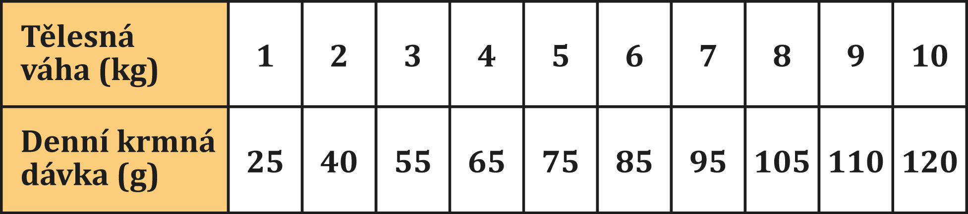 Tento návod je pouze orientační. Individuální potřeby vaší kočky se mohou lišit v závislosti na věku, plemenu, tělesné stavbě a aktivitě. Krmnou dávku ideálně rozdělte do 1 – 2 dávek. Při přechodu na nové krmivo provádějte změny postupně po dobu 7 – 10 dnů, postupně zvyšujte podíl nového krmiva každý den. Kočka musí mít vždy k dispozici dostatek čerstvé pitné vody.