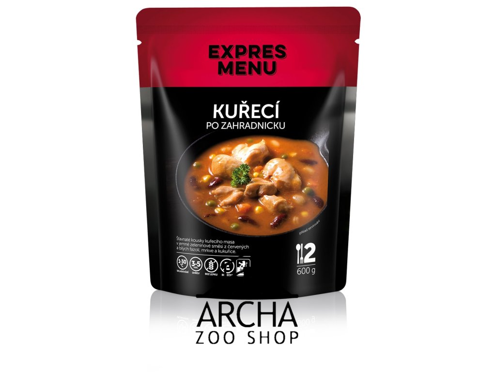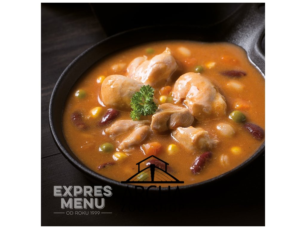 kuřecí stehenní maso (31 %), drůbeží vývar (voda, drůbeží maso a kosti), cibule, fazole, mrkev, hrášek, kukuřice, řepkový olej, rýžová mouka, kukuřičná mouka, sůl kamenná, paprika mletá, pepř, chilli.
